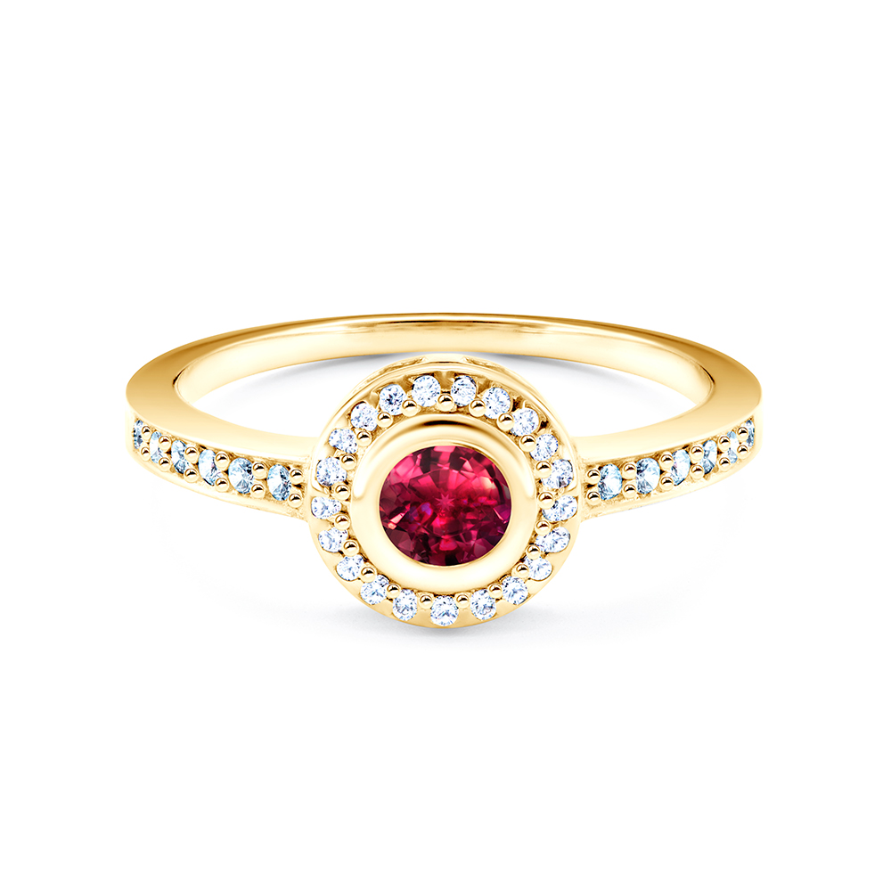 Pierścionek z rubinem o masie 0,29 ct, 12 diamentami w koronie, o szlifie brylantowym wysokiej czystości SI2/H, o łącznej masie 0,0528 ct (12x0,0044 ct) oraz 21 kamieniami w szynie (21x0,0024 ct). Wykonany z 14-karatowego żółtego złota (próba 0,585).
