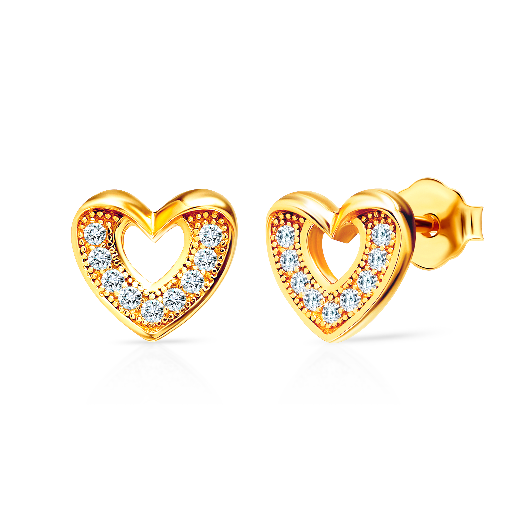 Kolczyki serca Savicki wykonane ze srebra (pr.925) pozłocone żółtym złotem. W kolczykach zostały osadzone cyrkonie o szlifie brylantowym.