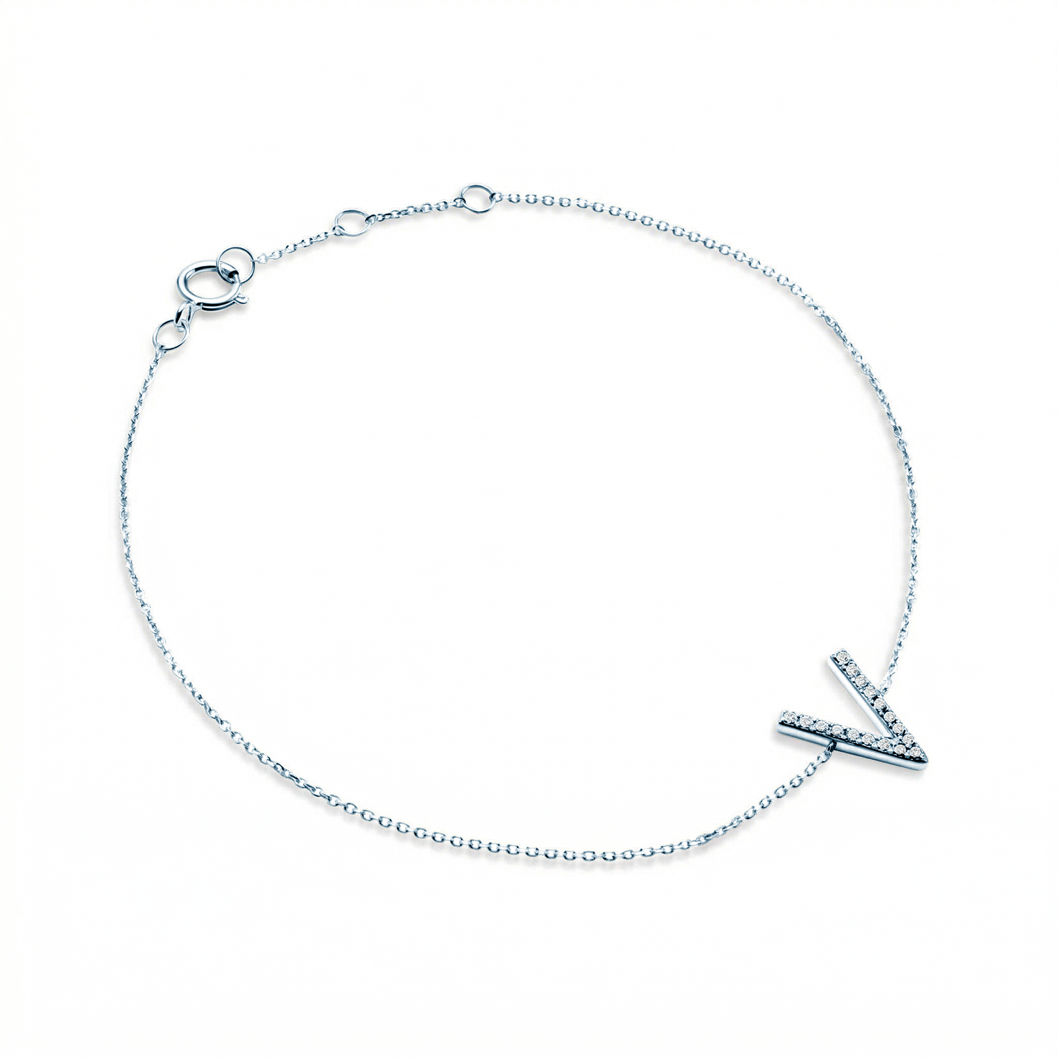 Bransoletka celebrytka litera V białe złoto 585 z białym diamentem 0.04ct 18cm